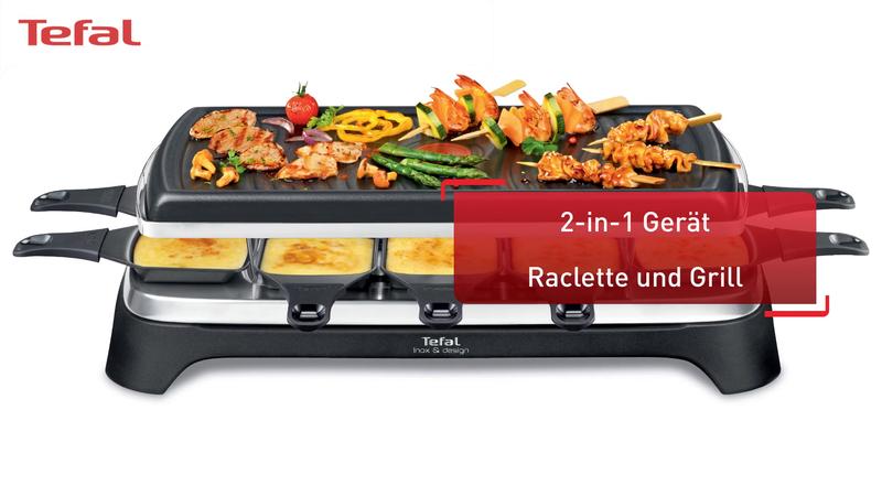 2 in 1: Raclette und Grill gleichzeitig Einfach zu verwenden: Thermo-Spot® zeigt optimale Vorheizung Einfache Reinigung: Antihaftbeschichtung auf Platte und Pfannen