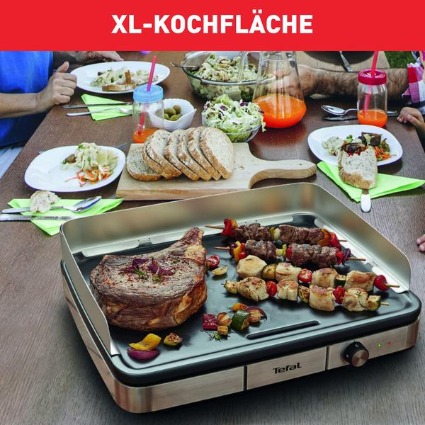 Freuen Sie sich auf besonders großen Genuss mit dem Tefal Maxi Plancha, dem extragroßen elektrischen Tischgrill im Teppanyaki Style. Die Grillplatte ist antihaftbeschichtet und durchgehend glatt. Auf ihr können Sie dank starken 2300W Leistung eine Vielzahl an Gerichten, neben Fleisch auch delikateres wie Meeresfrüchte oder Gemüse, gesund ohne Zugabe von Öl grillen und Braten. Verwenden Sie diese Version der spanischen Platte drinnen, da sich kaum Rauch entwickelt, oder draußen, mit dem enthaltenen, abnehmbaren Windschutz. Mit 5 Temperatureinstellungen klappt das Grillen im Handumdrehen; ebenso wie die Reinigung danach. Auch das ETM Testmagazin lobt den Maxi Plancha mit der Note GUT.