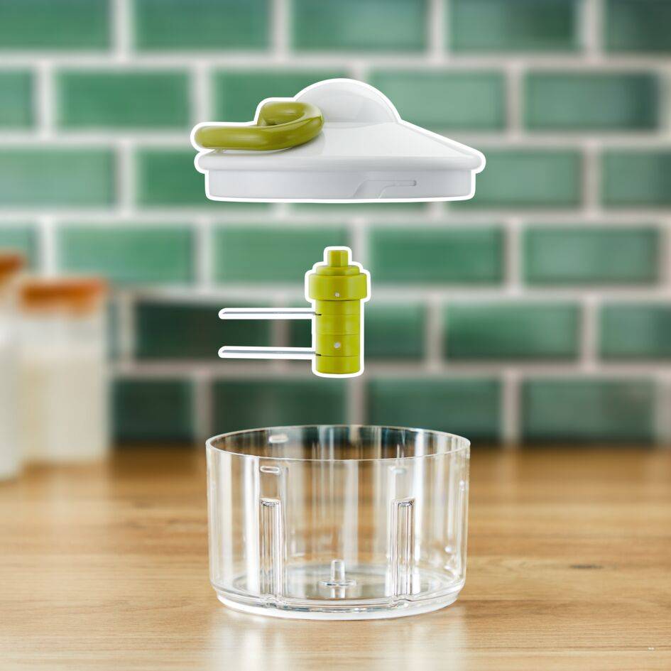 Öffnen Sie den Karton, nehmen Sie alle Teile heraus und entfernen Sie die Messerabdeckung (seien Sie vorsichtig und schützen Sie Ihre Finger). Waschen Sie den Behälter und den Rotor von Hand oder in der Spülmaschine. Waschen Sie den Deckel von Hand mit einem feuchten Schwamm. Nun können Sie loslegen!