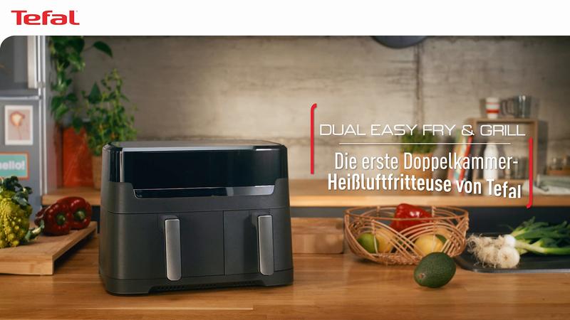 Bereiten Sie im Handumdrehen ein komplettes Gericht für die Familie mit der Dual Easy Fry & Grill, einer 8,3 l Doppelkammer-Heißluftfritteuse, die dank zwei unabhängiger Schubladen zwei unterschiedliche Speisen gleichzeitig zubereitet. In die XXL-Schublade passen große Zutaten wie ein Sonntagsbraten, während beide Schubladen großzügige Portionen Pommes frites und mehr frittieren können. Dank der 2 unabhängigen Garzonen können Sie die Kochprogramme, Garzeiten und Temperaturen in beiden Schubladen individuell einstellen und so im Handumdrehen köstliche Gerichte zaubern. Mit der SYNCH-Funktion stimmen Sie die unterschiedlichen Zubereitungszeiten aufeinaner ab und können so alles zur gleichen Zeit servieren. Die zusätzliche Grillfunktion und die Druckguss-Grillplatte sorgen für zarte, saftige Fleisch- oder Gemüsegerichte mit Grillstreifen und ohne Rauch oder unangenehme Gerüche. Die 8 voreingestellten Garprogramme erleichtern das Frittieren, Braten, Backen und Grillen. Dual Easy Fry & Grill ist 40 % schneller und bis zu 70 % energieeffizienter als herkömmliche Backöfen und wird mit einer kostenlosen Rezept-App geliefert, die zahlreiche inspirierende Rezepte bietet – von herzhaften Gerichten in nur 15 Minuten bis zu gesunden Ideen auf Heißluftfritteusen-Basis.
