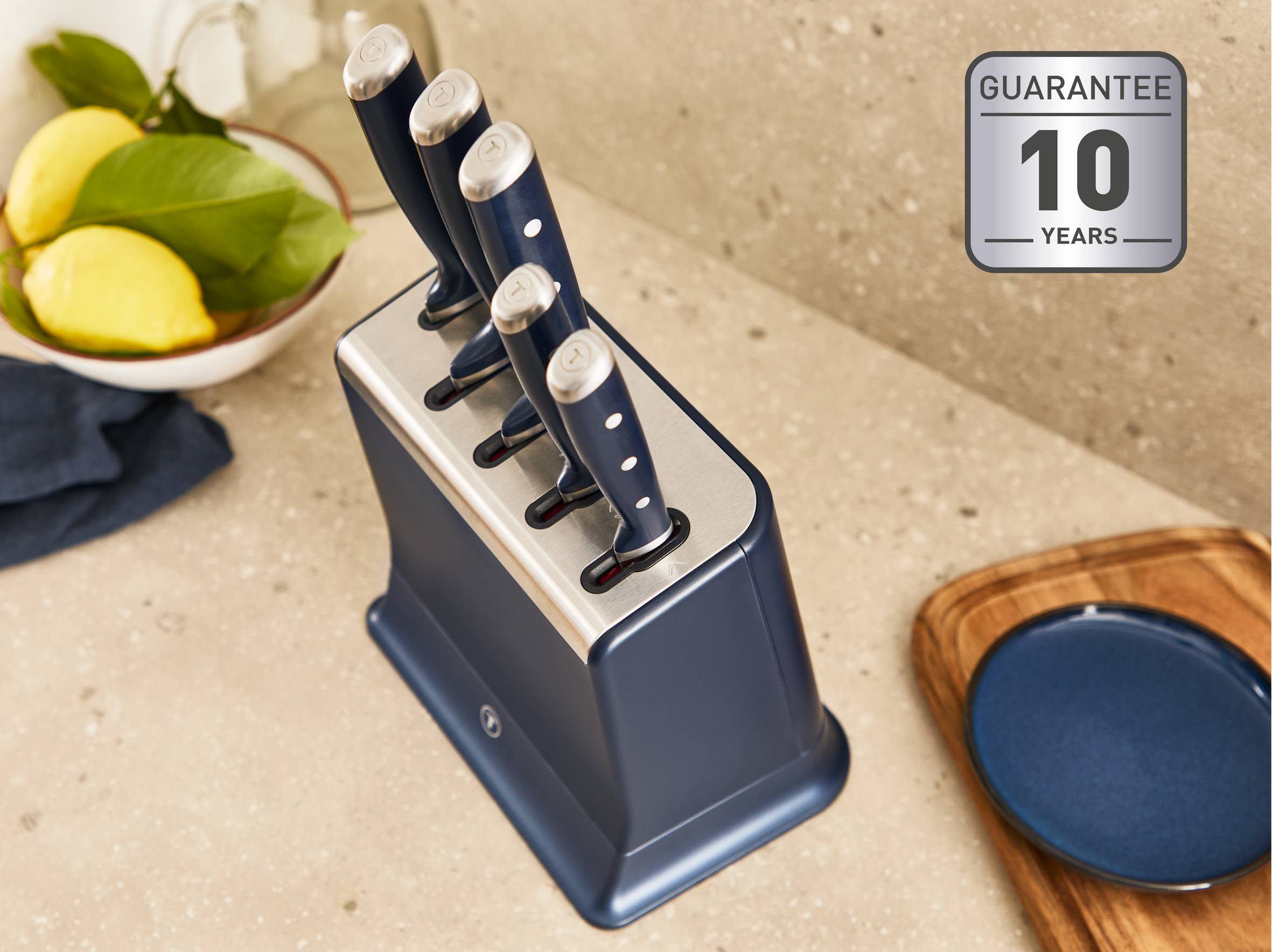 *Ausgenommen das Brotmesser, das nicht geschärft werden kann. **Die 10-Jahres-Garantie gilt für die Klingen (gegen Bruch) sowie für den Schärfmechanismus.