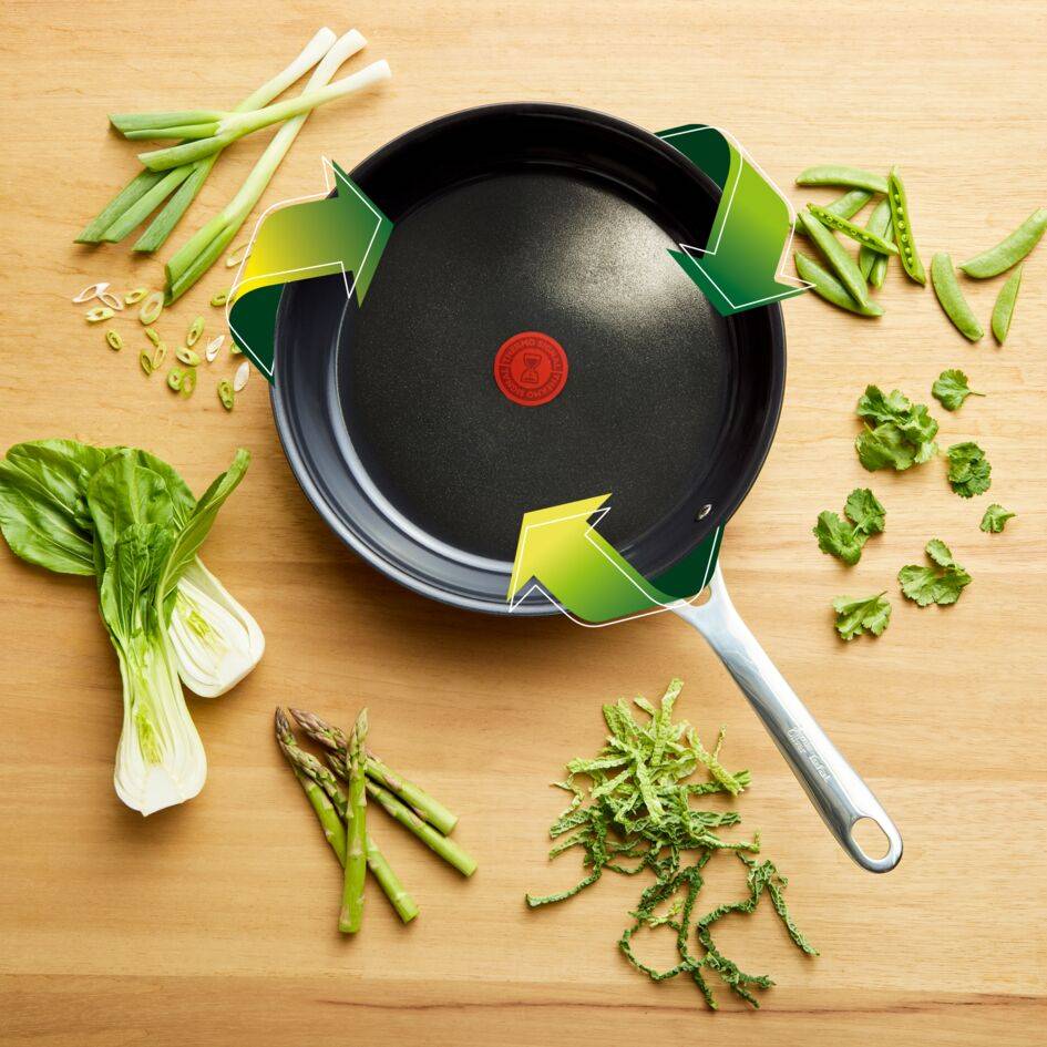 BESCHICHTUNG: Die neue Keramiktechnologie sorgt für eine besonders glatte Antihaftbeschichtung und ist ideal für Gerichte wie zarte Omeletts oder perfekt gebratene Pfannkuchen. RECYCELTER ALUMINIUMKÖRPER: Die Pfannenkörper bestehen aus recyceltem Aluminium* und ist recycelbar**. Recycelte Materialien machen mindestens 75 % des Gesamtprodukts aus. TEMPERATURINDIKATOR: Die Thermo-Signal™ Technologie von Tefal zeigt an, wann die Pfanne die ideale Brattemperatur erreicht hat - für garantiert perfekte Ergebnisse bei Konsistenz, Farbe und Geschmack. GRIFF & DECKEL: Das Kochgeschirr ist mit einem genieteten Edelstahlgriff ausgestattet. Der flache Edelstahl-Deckel ist hitzebeständig und leicht zu verstauen. SCHNELLES & GLEICHMÄSSIGES BRATEN: Der dicke Boden sorgt für eine schnelle und gleichmäßige Hitzeverteilung für müheloses Anbraten und köstliche Ergebnisse. VIELSEITIG & LANGLEBIG: Für alle Herdarten inkl. Induktion geeignet, ofenfest bis 250 °C. Inklusive Pfannenschoner