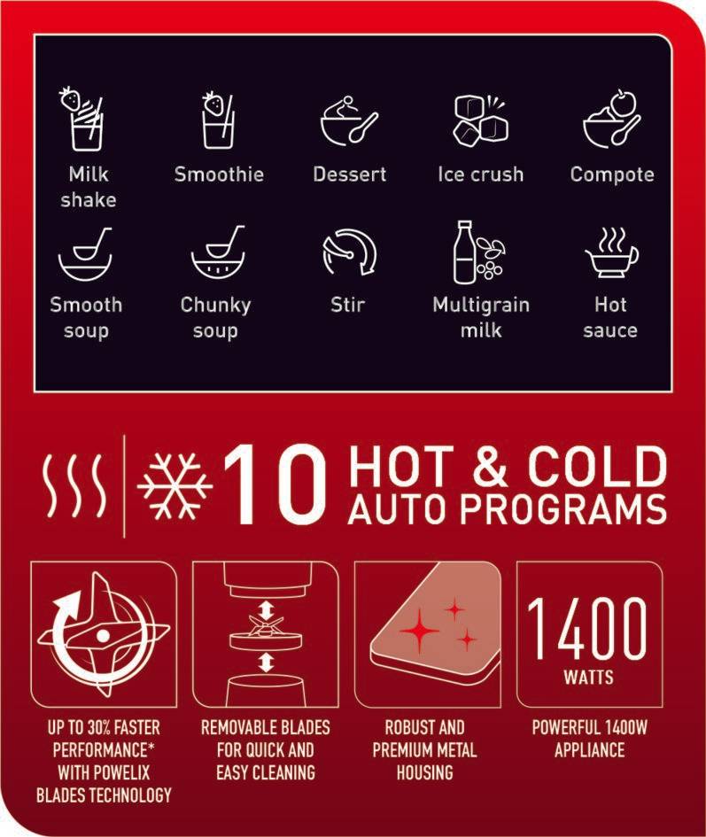 KÜCHENMASCHINE MIT KOCHFUNKTION mit einer großen Auswahl an heißen, kalten, festen und flüssigen Rezepten 10 AUTOMATIKPROGRAMME: 4 kalte Zubereitungen (Smoothie, Milchshake, Dessert, Ice Crush) und 6 heiße Zubereitungen (Kompott, cremige Suppe, grob gemixte Suppe, Umrühren, Mehrkornmilch, scharfe Soße) auf Knopfdruck 1400-W-MOTOR UND EXKLUSIVE POWELIX-KLINGEN für einen bis zu 30 % schnelleren Mixvorgang*. ABNEHMBARE KLINGEN machen das Reinigen mühelos, ebenso wie die Tiefenreinigungsfunktion, die 99,99 % der Bakterien** abtötet, ohne dass Spülmittel erforderlich sind. DER MITGELIEFERTE DAMPFKORB verwandelt den Behälter in einen Dampfgarer mit hohem Fassungsvermögen (+/- 500 g) – ideal für die Zubereitung gesunder Mahlzeiten LIEFERUMFANG: Dampfkorb, Messglas, Messlöffel