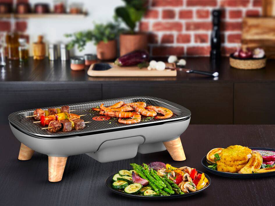 Wir stellen Ihnen den „Plancha des Saveurs Gourmet“ von Tefal vor, einen leistungsstarken Elektrogrill, mit dem Sie all Ihre Zutaten auf köstliche, geschmackvolle Weise zubereiten – von dicken Fleischstücken und Fisch bis hin zu Eiern, Gemüse und sogar Obst. Seine glatte Aluminium-Kochplatte liefert 2400 W Leistung für ein perfektes, gleichmäßiges Anbraten, während die Titanium Force Antihaftbeschichtung mit Thermo-Spot® Technologie Ihnen ein Braten ohne Öl oder Anbrennen ermöglicht. Ideal für die gesunde und geschmackvolle Zubereitung von Fleisch ohne Fettzusatz. Der einstellbare Thermostat des Grills mit fünf Garstufen ermöglicht eine optimale Anpassung an jede Zutat. Die großzügig konzipierte Kochfläche eignet sich hervorragend für große Mahlzeiten mit Familie und Freunden. Das Gerät ist einfach zu bedienen und zu reinigen und wird zusammen mit einem köstlichen Rezeptbuch geliefert, das zehn leckere Ideen liefert, die das Grillen zum Gourmetvergnügen werden lassen!