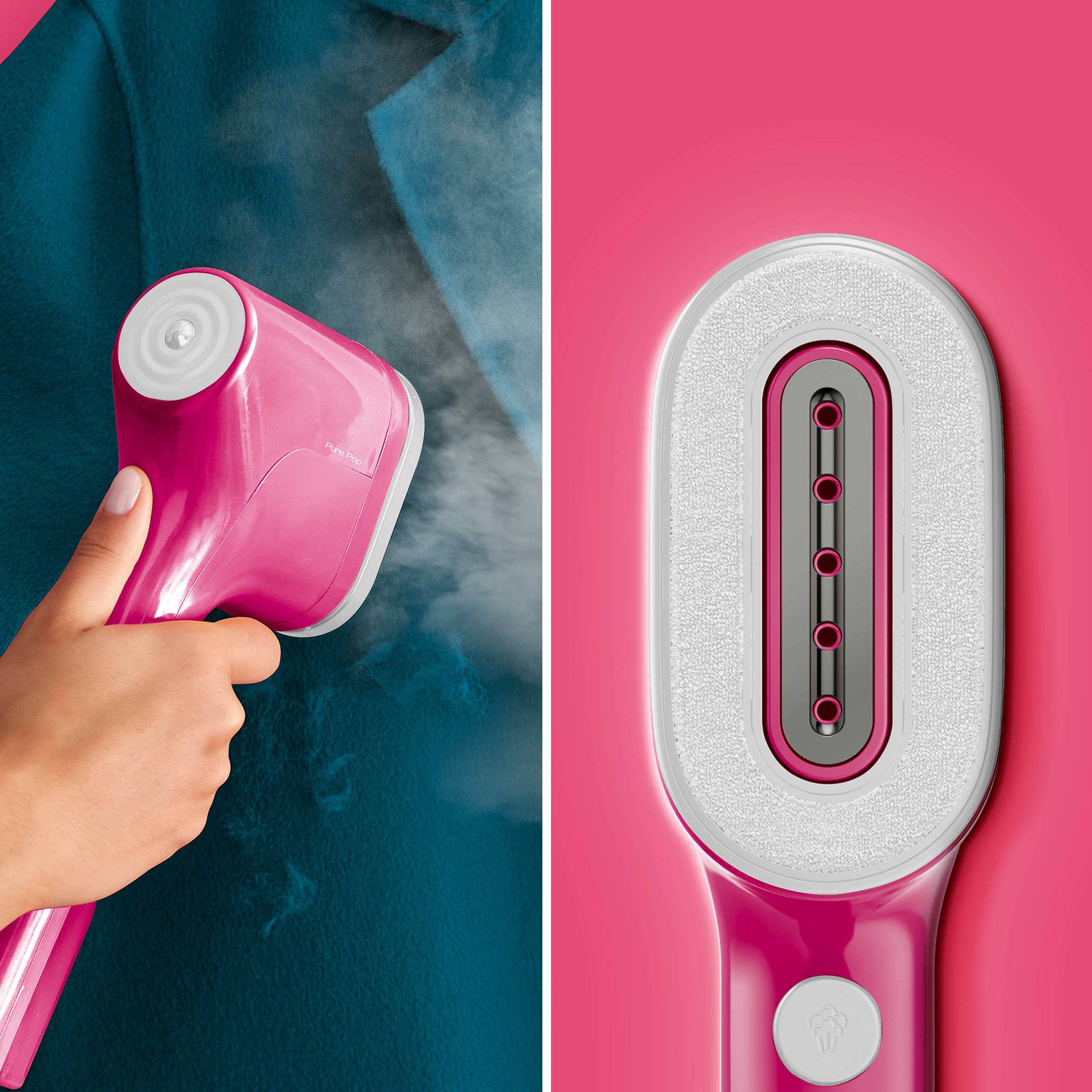 Schließen Sie sich der Bewegung an: Wir stellen vor: Tefal Pure Pop, Ihre persönliche Dampfbürste, die jedes Kleidungsstück auch unterwegs dampfbügelt. Diese tragbare Lösung zur Textilpflege ist äußerst intuitiv und sorgt für eine vollständige Pflege mit einer einzigen sanften und natürlichen Bewegung. Das exklusive System mit wendbarem Fussel- und Samt-Pad sorgt für einen mühelosen Wechsel. Dank des ultrakompakten und schlanken Designs können Sie das Gerät überallhin mitnehmen! Mit Pure Pop setzten Sie bei Textilpflege ganz neue Standards ... und das mit einem Hauch von Dynamik.