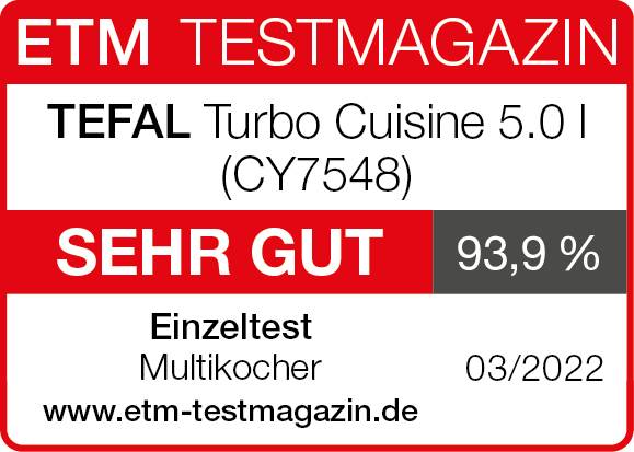 Das ETM-Testmagazin hat dem Turbo Cuisine Multikocher die Bestnote "Sehr gut" (93,9%) verliehen. Eine außerordentliche Vielfalt an Garprogrammen, exzellente Garresultate sowie ein geringer Stromverbrauch, so urteilt das ETM-Testmagazin über den schnellen Multikocher.
