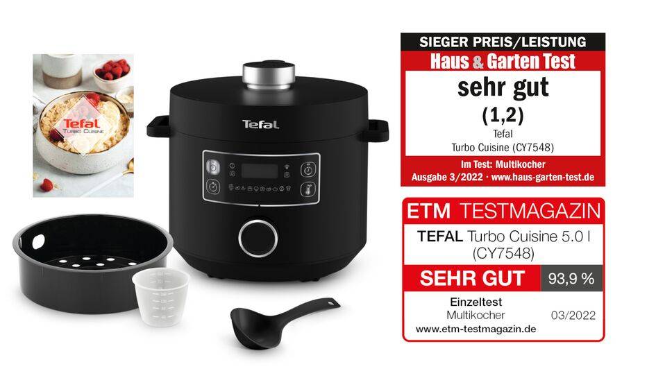 Genießen Sie all Ihre Lieblingsgerichte im Handumdrehen! Tefal TURBO CUISINE ist ein schneller Multikocher, der köstliche Kochergebnisse garantiert und das sogar bis zu 3x schneller und bis zu 80% energieeffizienter als mit herkömmlichen Kochgeschirr auf dem Herd. Ausgestattet mit einem speziellen Design und exklusiver Technologie für perfekte Gerichte, die jeden Tag aufs Neue gelingen. Die patentierte Technologie der kugelförmigen Kochschüssel von Tefal bietet eine größere Heizfläche mit optimaler Wärmeverteilung und -zirkulation. Das Ergebnis sind zarte, saftige Gerichte für Sie und die ganze Familie. Frisch gekochte Lieblingsgerichte, vollkommen mühelos und zeitsparend zubereitet. Entdecken Sie allseits beliebte Familiengerichte, von Vorspeise bis Dessert und das alles in einem Gerät. Nutzen Sie Turbo Cuisine als Schnellkochtopf, zum gesunden Dampfgaren, klassisches Garen wie Anbraten, Slow Cooking, zum Zubereiten von Reis, Suppen, Joghurt und vielem mehr - alles in wenigen Schritten mit einem einzigen, intuitiven Drehknopf zubereitet. Wählen Sie aus einem der 10 automatischen Kochprogramme oder dem manuellen Kochmodus und erleben Sie den Unterschied mit dem einzigartigen Multikocher, der all Ihre Kochbedürfnisse erfüllt und dabei mindestens sieben Kochgeräte in Ihrer Küche ersetzt.